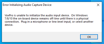 - There must be a sound card that has an active input on Windows 10 or higher. If, for example, a laptop has its built-in microphone disabled, this error will occur until either the microphone is enabled or a microphone is plugged into a sound card. Look in the Windows Control panel under Sound and verify there is an active input available; if the devices are greyed out Windows will prevent VoxPro from creating a record buffer.