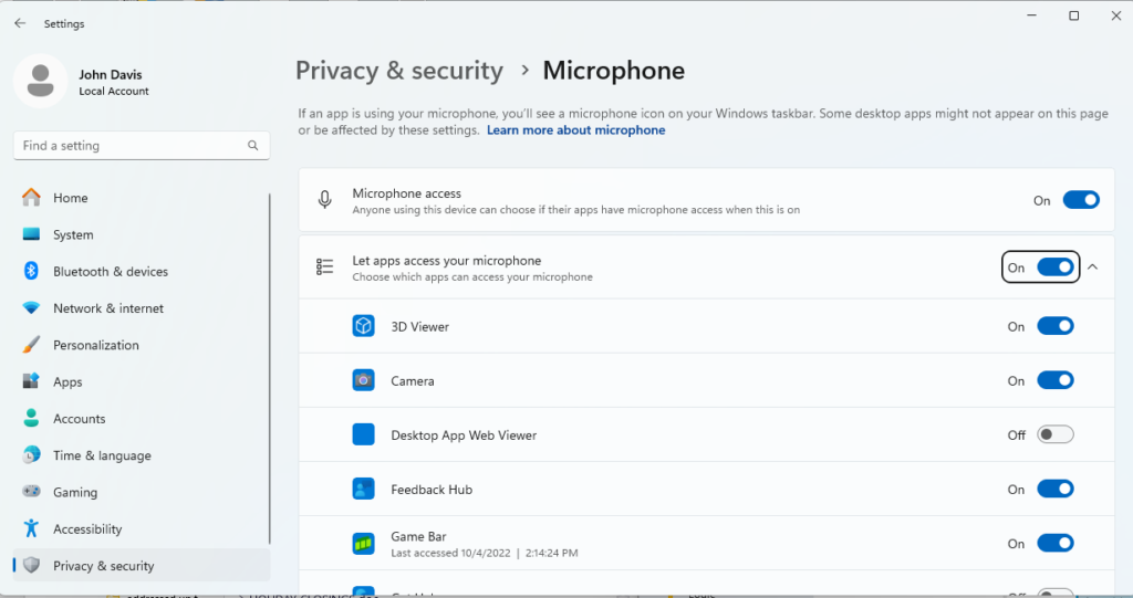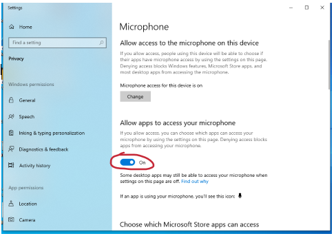 - Mic Privacy must be enabled in Windows 10 or higher. In Windows 10 it looks like this: