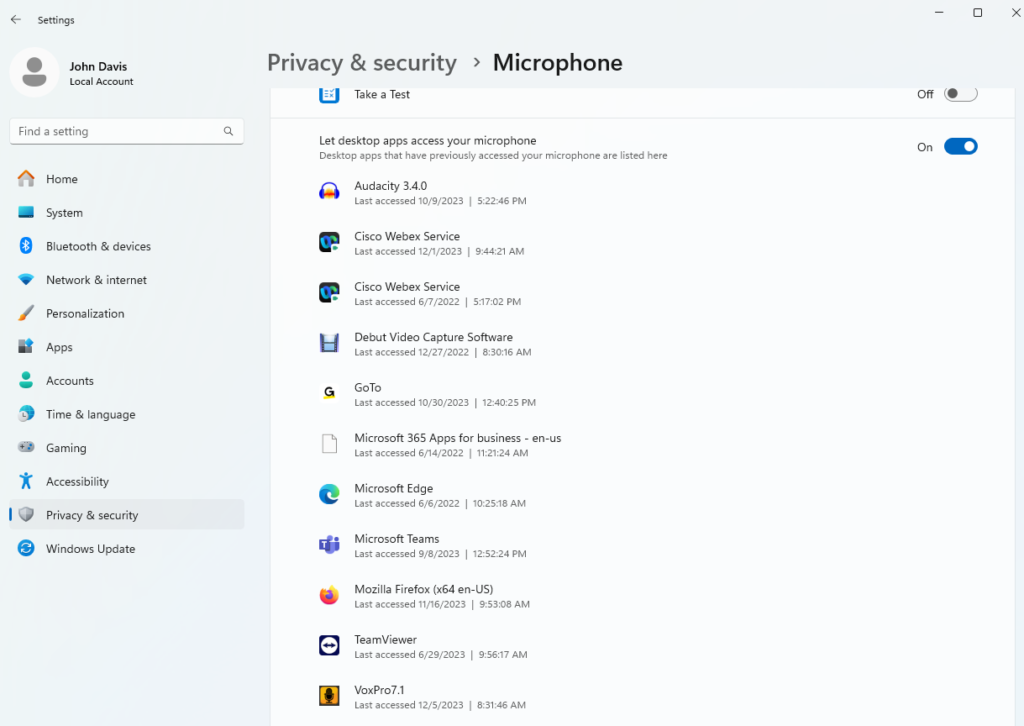 Also, in Windows 11, scroll down past the Microsoft Store apps and make sure that you allow desktop apps to access your microphone, as VoxPro is considered a Desktop App.
